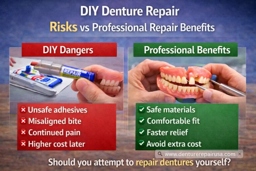 The safest and most effective solution is to trust experienced dental technicians who specialize in denture repair. Professional repair ensures: